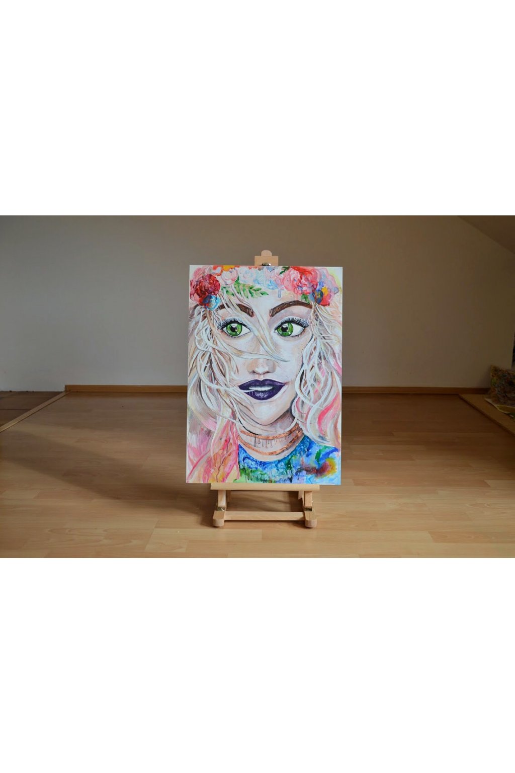 Svobodu, intelekt a nespoutanou kreativitu, kterou představuje dívka s květinami ve vlasech a šibalským úsměvem můžete načerpat z obrazu od Hany Melcrové s názvem Vzduch. Na obraze se propojují barvy jara, kombinace světle zelených očí a pestrobarevných květin navozuje pocit radosti a naděje. Výrazně fialové rty jsou znakem dobrodružství a rozmanitosti života. Obraz je nejen ideální dekorací, ale také podpořením tohoto živlu ve vás nebo v prostředí, kam ho umístíte. Svůj element si můžete vybrat podle znamení, nebo pocitu, který z živlů právě ve vašem životě nejvíc schází.